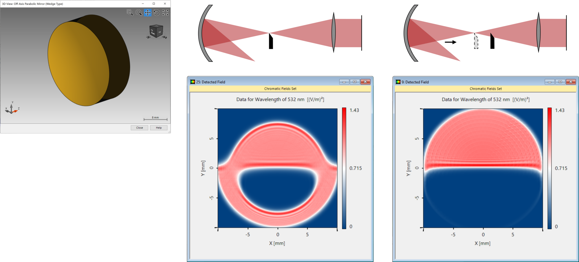 Since 1858 the Foucault knife-edge test has been a simple and inexpensive method to determine the properties of a concave shaped mirror. As the name suggests, in this test, a knife’s edge (e.g. a razor blade) is held in the path of the beam, close to the expected focal point, to obscure half of the beam. The transmitted field is then again collimated before evaluation. The resulting pattern provides an indication of the shape of the mirror used. Furthermore, if the position of the knife-edge is varied along the optical axis, the resulting light pattern at the detector plane will also change. This behavior enables the user to precisely determine the position of the focal point of the curved mirror.