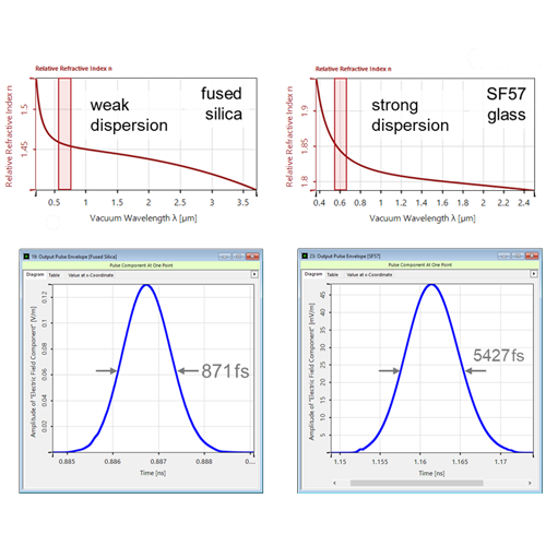 Precise control over the ultrashort pulses is of importance for various applications. Prisms and gratings are typical optical components that are used for manipulating the temporal behavior of pulses. In this example, we use two transmission gratings, according to the work of T. Clausnitzer et al., to build up a stretching / compressing system for ultrashort pulses. Particularly, we analyze the polarization-dependent effects that is caused by the gratings, and we optimized the gratings to obtain a polarization-independent system with high efficiency.