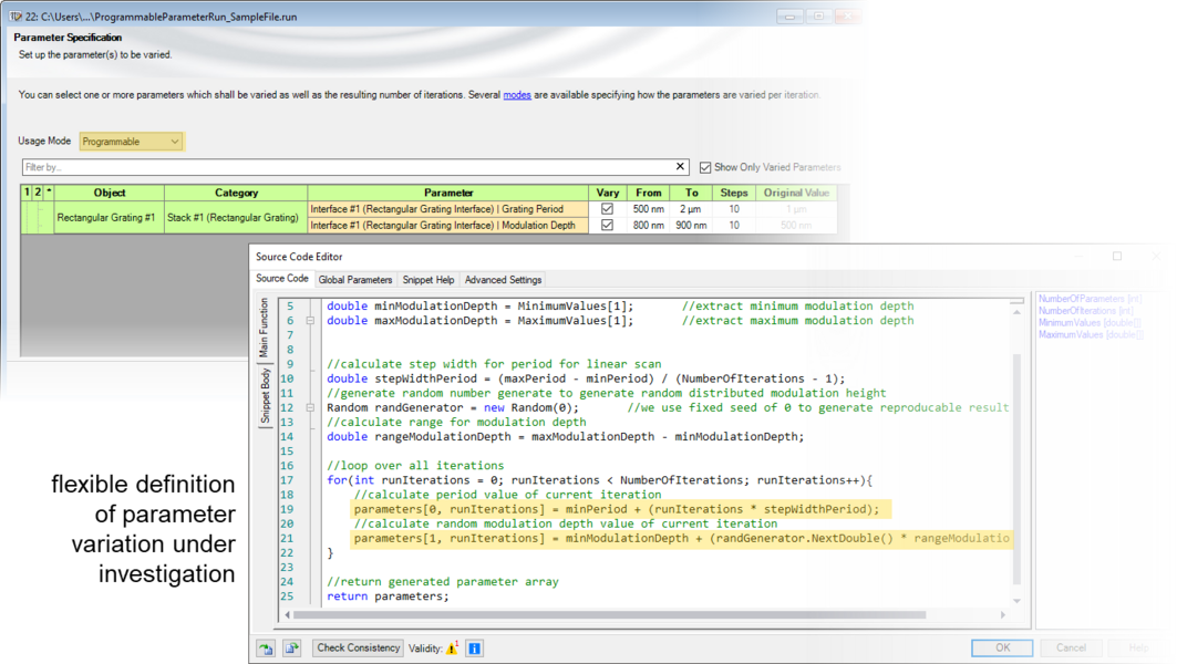 Systematical variations of parameters are substantial for detailed investigations of complex optical systems. VirtualLab Fusion enables the variation of parameters by the so-called parameter run feature. By using the parameter run, such variations can be configured arbitrarily, depending on the demands of the task of analysis. Further, the special programmable mode allows a free configuration in order to provide fully customizable parameter variations. In an example, the application of this programmable mode is presented.