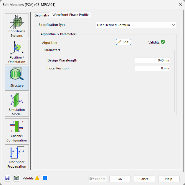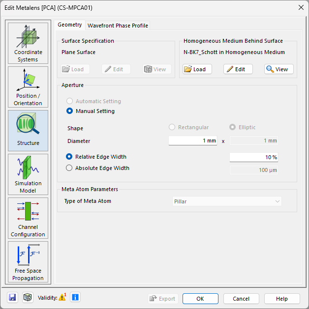 After adding the metalens component to your system, configure the basic properties: the medium after the component and the aperture diameter (shape is always circular). Then define the wavefront phase profile – the phase transformation to be applied by the metalens.
