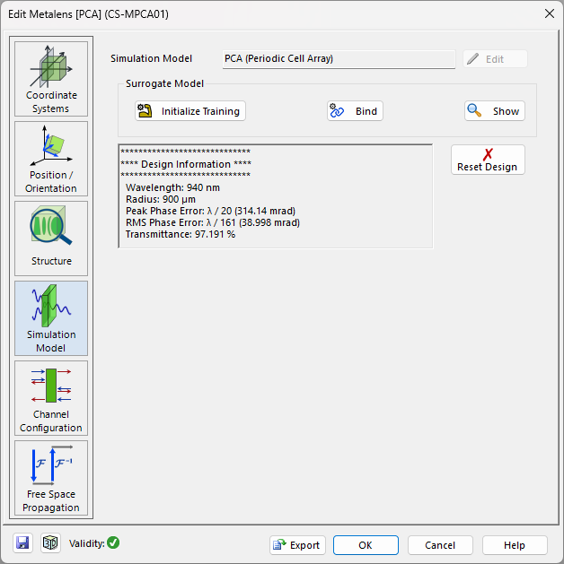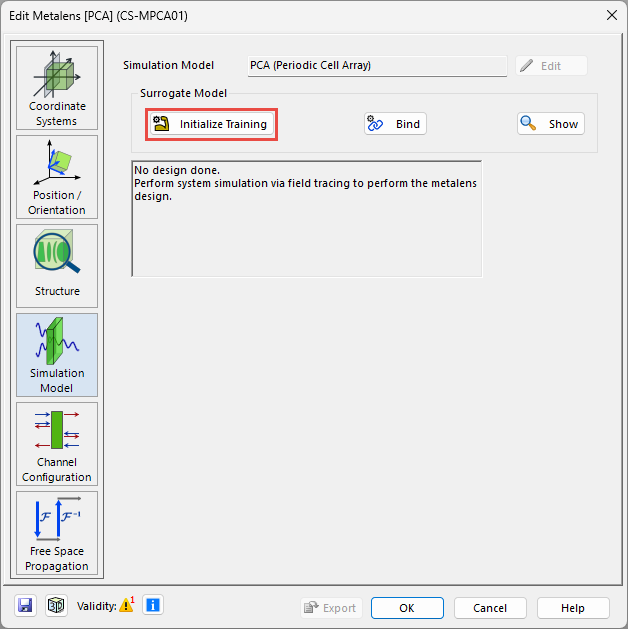 - Initialize training – click the corresponding button in the metalens edit dialog or use the Surrogate ribbon in the main window.