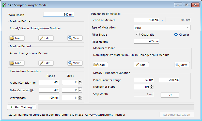 - Configure the solution space – define the geometrical parameters (width, length, radius) and incident light conditions (wavelengths, incidence angles) to be covered by the surrogate model.