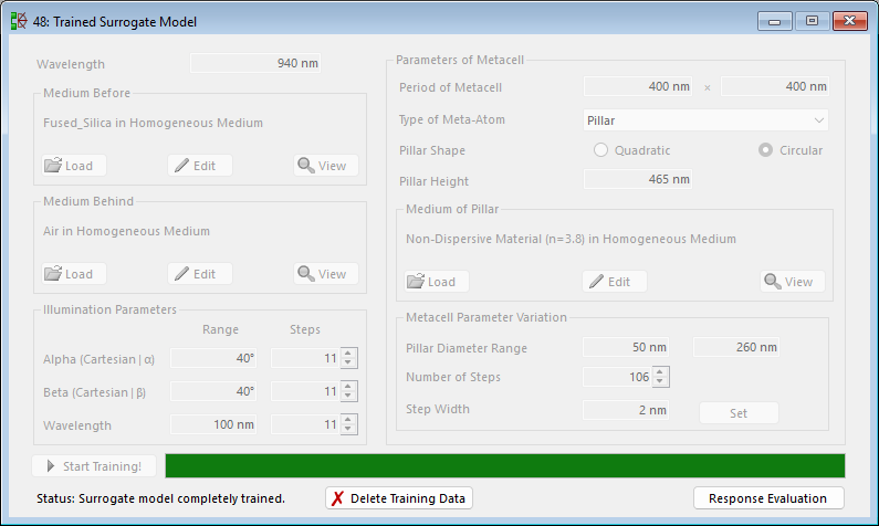 💡 Note: After training, the surrogate model includes response evaluation tools. You can use these tools independently – outside of full system simulation – to analyze meta-atom behavior and verify optical response before system-level design.