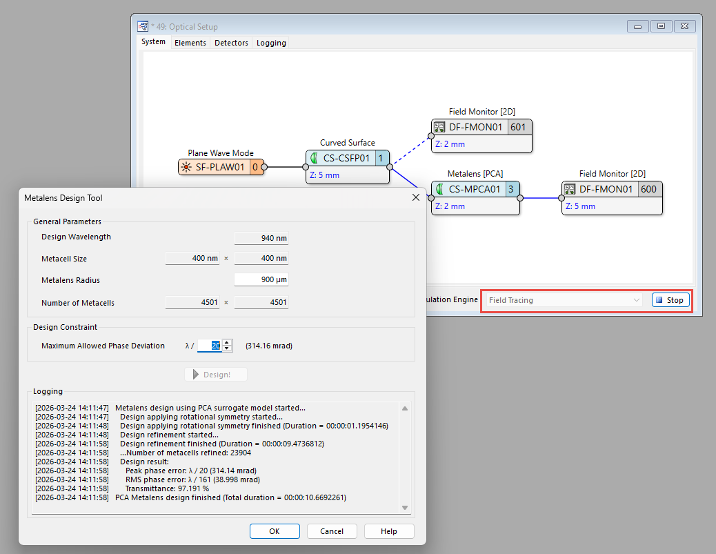 Field Tracing (The Design Step) – The first time you run a field tracing simulation, a design dialog opens where you can configure the design parameters and perform the design. Once the design is complete, it is stored into the metalens component and the simulation resumes using the designed data.
