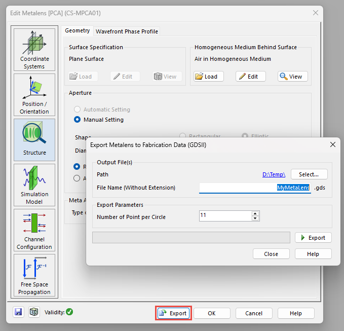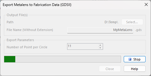 Once you are satisfied with the performance of your metalens in simulation, you can generate fabrication data. The metalens is now designed, and the built-in fabrication export – accessible via the edit dialog of the metalens component – allows you to configure several parameters and finally generate a standard GDSII file. This file contains the shape, size, and position of every meta-atom in your design and can be easily transferred to fabrication.