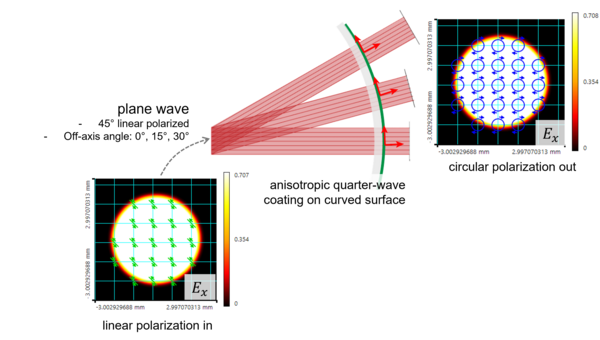 This use case introduces the feature of adding anisotropic coatings on surfaces and investigates the polarization conversion of a lambda/4 coating on a plane surface and a curved surface, respectively.