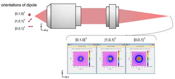In VirtualLab Fusion, the double-helix PSF be analyzed in a straightforward manner by inserting a phase mask in the pupil plane of a high-NA microscopy system. It is demonstrated that the double-helix PSF rotates tangibly even when there is only a small defocus (~130 nm) of the object point.
