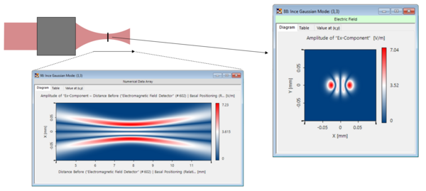 This example exhibits the variation of the focal length of a thermal lens, as well as the resulting focus beam diameter for different input power settings [W. Koechner, Appl. Opt. 9, 2548–2553 (1970)]. This example is published in [H. Zhong, J. Opt. Soc. Am. A 35].
