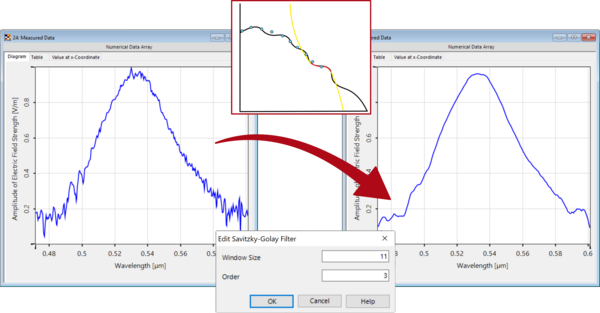 We illustrate how to import the experimentally measured spectrum of sunlight into VirtualLab Fusion, and how to use it to describe the spectral composition of a source in an optical system. In addition, we demonstrate how to employ the inbuilt Savitzky-Golay filter to smooth potential noise out of imported measured data, which can be a crucial preliminary step when it comes to using experimentally measured data in a simulation.