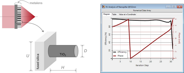 Metalenses and metasurfaces have risen to scientific fame by virtue of their unique properties for manipulation of electromagnetic fields. Thanks to recent advances in nanofabrication technologies, their manufacture has also become feasible. A key step in the design of metasurfaces is finding the appropriate building blocks that make up the surface. With the Fourier modal method (FMM, also known as RCWA) in VirtualLab Fusion, one can perform a rigorous analysis of such nanostructures, with access to the full electromagnetic information. As an example, the performance of nanopillars with varying diameters is evaluated.