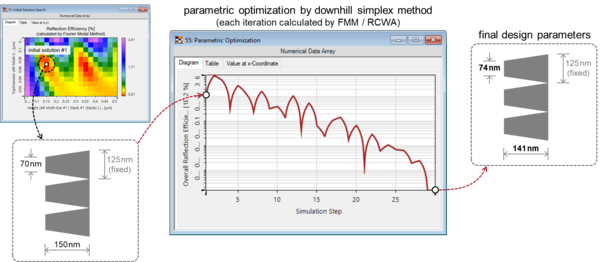 With the Fourier modal method and the parametric optimization in VirtualLab Fusion, we demonstrate the analysis and design of anti-reflective moth-eye structures.