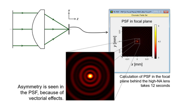 When a linearly polarized Gaussian beam is focused by a high-NA aspheric lens, the PSF in the focal plane shows an asymmetry due to vectorial effects.