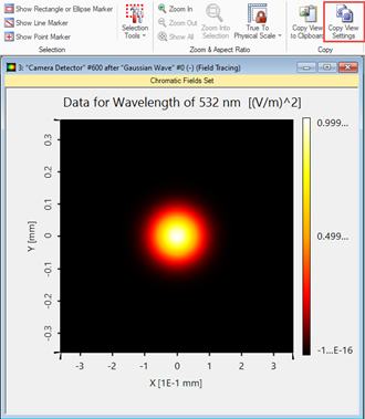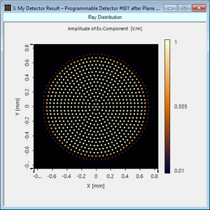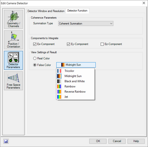 - The camera detector can be used to calculate the energy density distribution for the incident field. The result is displayed by a chromatic fields set, which provides a real and a false color display. If a wavelength which falls outside the visible range is present in the spectrum, VirtualLab Fusion will switch automatically to the false color mode and log a message in the message window.