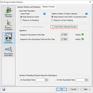 - First ensure that the snippet of your detector returns one and only one list of physical values as a result. Take care that the right snippet is executed during your simulations. Furthermore, for technical reasons, the number of physical values made available for parametric optimization must be specified in the edit dialog of the detector. If this number is lower than the actual number of physical values in the detector results, then not all the physical values delivered by the detector will be available as merit function constraints. In contrast, if this number is larger than the actual number of physical values in the detector results, the resulting target function might be non-computable and thus the parametric optimization might fail.