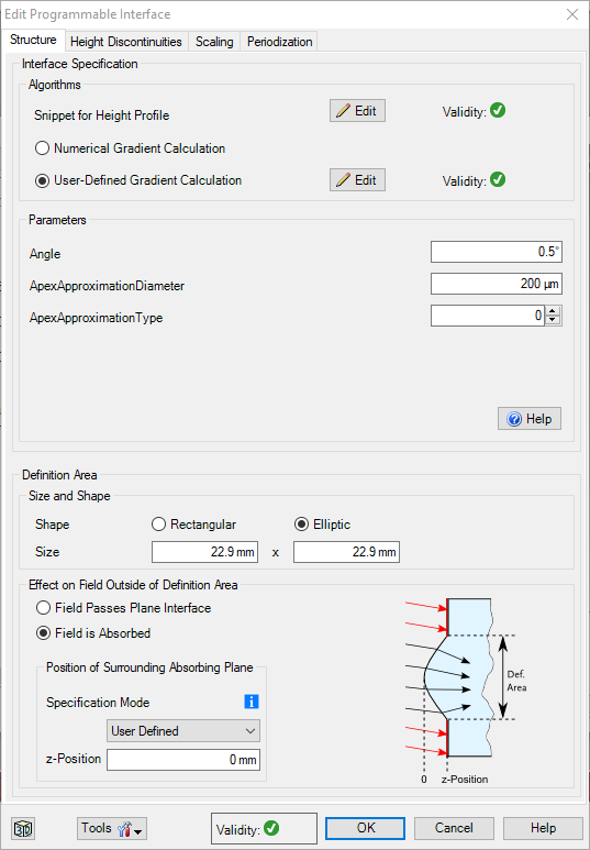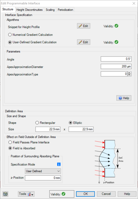- VirtualLab Fusion supports the import of OpticStudio setups. With this import mechanism, several standard surfaces are automatically converted into VirtualLab optical interfaces (see manual for details). The import of custom surfaces defined in Zemax is, however, not supported. Nevertheless, it is possible to define any height profile by a user defined formula in VirtualLab using snippets within the programmable interface. This technique provides a user-friendly way to realize your specific optical interface which is fully embedded in the framework of the VirtualLab user interface (like using parameter run, parametric optimization, …). The programmable interface even supports the user by generating a customized graphic user interface automatically.