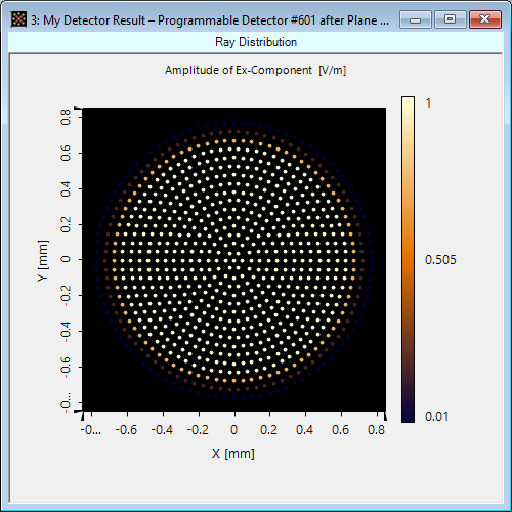 - In former versions of VirtualLab Fusion the raw data container displayed the non-equidistant field data when the detector was placed in the homeomorphic zone of a field. This functionality has been disabled since the 2019 summer release of VirtualLab Fusion. To enable the visualization of the aforementioned raw data, the programmable detector (in its default implementation) can be used. Therefor simply add a programmable detector to your system, at the location where you want to see the field. Then edit the programmable detector and deactivate the option “Use spectral field” (optionally you can also specify to use only homeomorphic (direct and inverse) Fourier transforms).