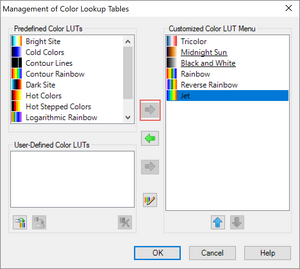 You can select the color lookup tables for the color menu and import user defined color tables. In addition, the selection for the color table menu also has an influence on all those instances where color tables can be selected (e.g. within the camera detector).